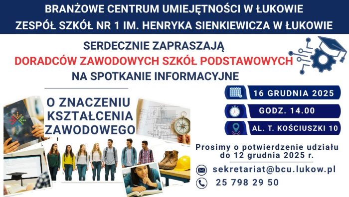 Branżowe Centrum Umiejętności w Łukowie, w odpowiedzi na potrzeby rynku pracy, zaprasza doradców zawodowych szkół podstawowych na spotkanie informacyjne, które odbędzie się 16 grudnia 2025 r. (wtorek) o godz. 14.00 w siedzibie BCU przy Zespole Szkół Nr 1 im. H. Sienkiewicza w Łukowie, ul. Al. T. Kościuszki 10.