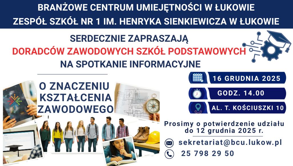 Branżowe Centrum Umiejętności w Łukowie, w odpowiedzi na potrzeby rynku pracy, zaprasza doradców zawodowych szkół podstawowych na spotkanie informacyjne, które odbędzie się 16 grudnia 2025 r. (wtorek) o godz. 14.00 w siedzibie BCU przy Zespole Szkół Nr 1 im. H. Sienkiewicza w Łukowie, ul. Al. T. Kościuszki 10.