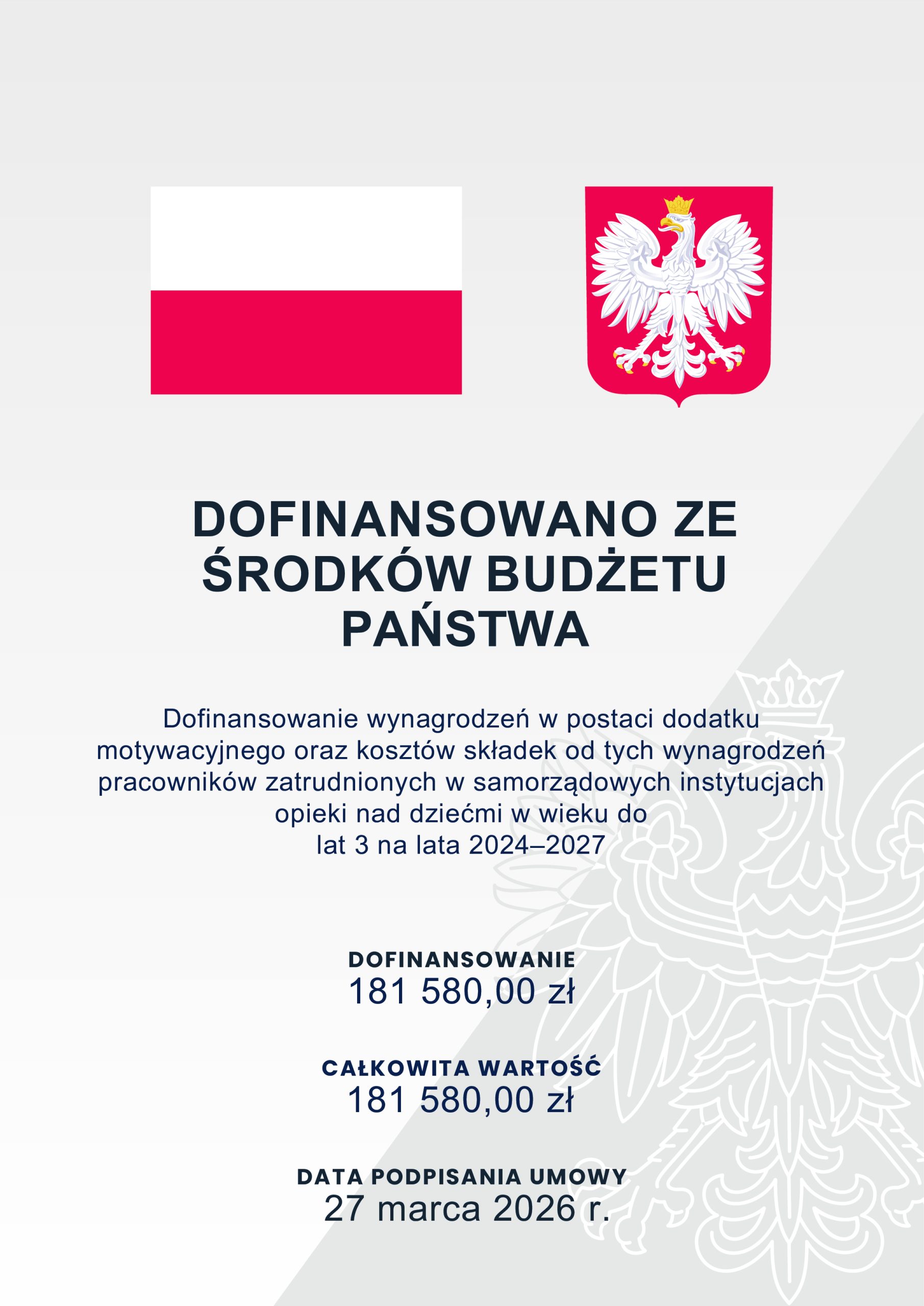 Na mocy Uchwały nr 64 Rady Ministrów z dnia 19 czerwca 2024 r. ustanowiono rządowy program pn.: „Dofinansowanie wynagrodzeń w postaci dodatku motywacyjnego oraz kosztów składek od tych wynagrodzeń pracowników zatrudnionych w samorządowych instytucjach opieki nad dziećmi do lat 3 na lata 2024-2027”.