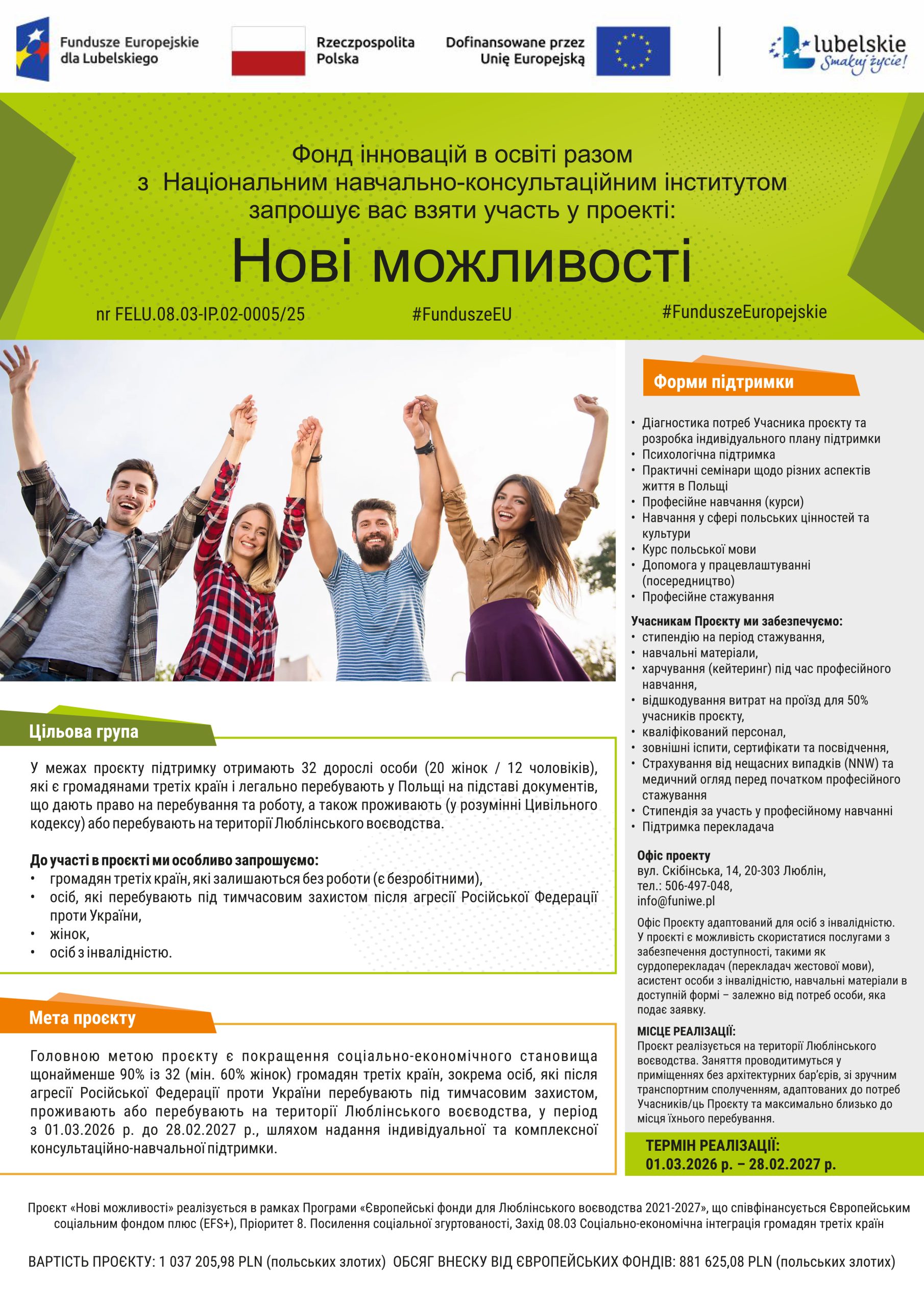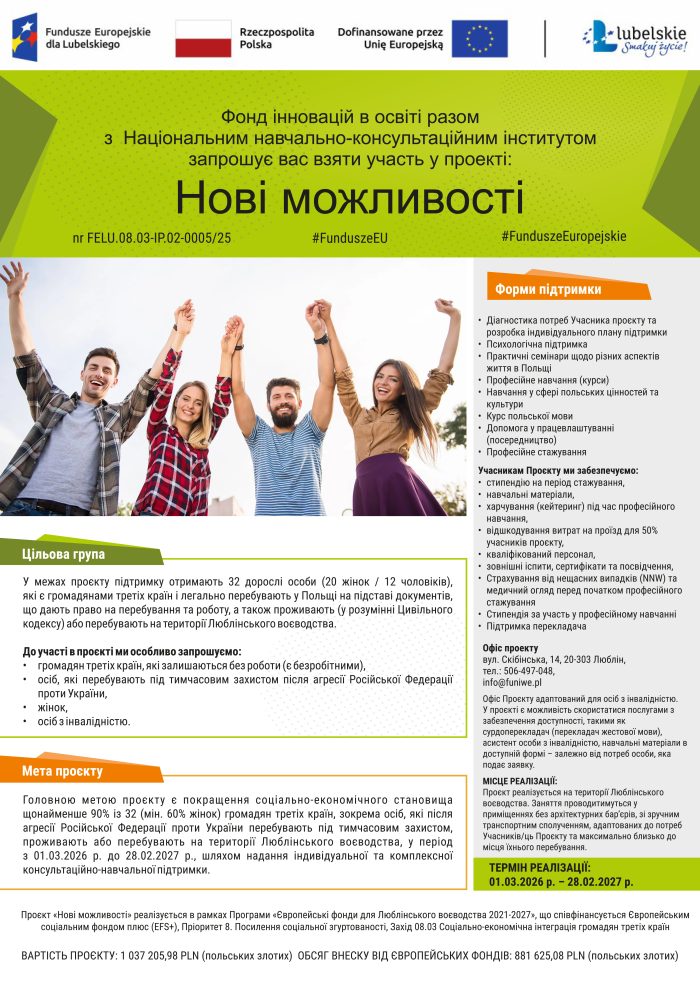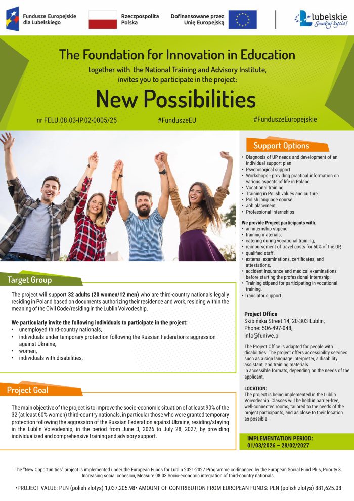 FUNDACJA INNOWACJI W EDUKACJI wraz z KRAJOWYM INSTYTUTEM SZKOLENIOWO-DORADCZYM Sp. z o.o., w ramach Programu Fundusze Europejskie dla Lubelskiego 2021-2027 współfinansowanego ze środków Europejskiego Funduszu Społecznego Plus, Priorytet 8. Zwiększanie spójności społecznej, Działanie 08.03 Integracja społeczno-gospodarcza obywateli państw trzecich, realizuje projekt pt: „Nowe możliwości” nr FELU.08.03-IP.02-0005/25